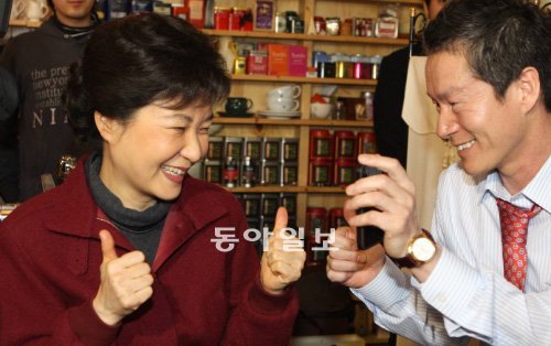 새누리당 박근혜 비상대책위원장이 14일 ‘감동 인물 찾기’ 프로젝트의 첫 일정으로 서울 종로구 누상동의 카페 ‘티아트’를 방문했다. 카페 운영자 박정동 씨가 휴대전화를 이용한 응원 화면을 보여주자 박 위원장이 활짝 웃고 있다. 카페 직원들은 청각장애인이다.