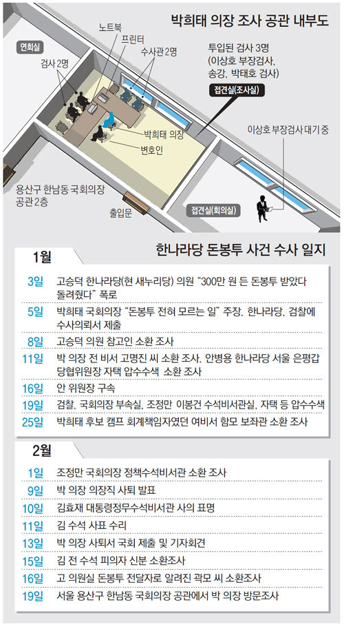 이날 조사는 지휘 책임을 가진 서울중앙지검 공안1부 이상호 부장검사와 직접 조사를 맡은 송강, 박태호 검사가 담당했다. 앞서 수사관들은 손수레 2대에 80cm 높이로 실은 1만 여 쪽 분량의 조서 뭉치와 노트북컴퓨터, 프린터 등을 갖고 공관에 도착했다. 지금까지의 조사 내용을 담은 서류와 박 의장 조사에 필요한 장비들을 가져온 것이다. 조사가 이뤄진 공관 연회접견동 2층에는 연회실과 2곳의 접견실이 있다. 검찰은 접견실을 조사실과 회의실로 사용했다. 조사실에서는 두 검사가 각각 노트북컴퓨터를 앞에 두고 번갈아가며 조사를 벌였다. 검찰은 박 의장의 사퇴서가 아직 처리되지 않은 점을 고려해 ‘진술인’ 또는 ‘피의자’가 아니라 ‘의장님’이라는 호칭을 사용했다.
