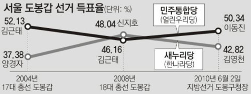 《 서울 도봉갑은 지난해 타계한 김근태 전 민주통합당 상임고문이 내리 3선을 지냈으나 18대 총선에서 패배한 선거구다. 현역인 새누리당 신지호 의원은 이번에 공천을 받지 못했다. 그 대신 여야 모두 여성 후보를 내세웠다. 현재 판세는 김 전 고문의 부인인 민주당 인재근 후보가 다소 우세하지만 기업인 출신 새누리당 유경희 후보의 추격이 만만찮다. 》