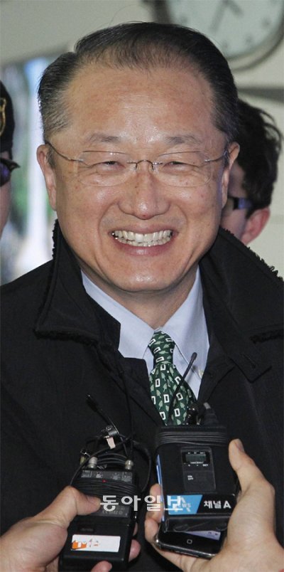 미국이 세계은행 차기 총재 후보로 지명한 김용 다트머스대 총장이 1일 도쿄발 대한항공(KE704) 편으로 지명 후 처음 한국을 찾았다. 중국, 일본, 에티오피아 등 세계은행 주요 회원국들에 지지를 호소하기 위한 ‘경청 투어’차 방한한 김 총장은 2일 박재완 기획재정부 장관과 비공개 조찬을 한 뒤 청와대를 방문해 이명박 대통령과 만날 예정이다. 김 총장이 1일 인천국제공항을 통해 입국한 뒤 기자들의 질문을 받고 있다.