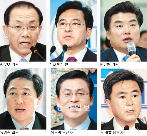 새누리당 당권 경쟁이 뒤늦게 본격화됐다. 전당대회 출마를 선언한 황우여 심재철 원유철 유기준 의원, 정우택 김태흠 당선자(왼쪽부터). 동아일보DB·뉴시스