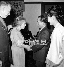 퍼스트레이디 박근혜 1976년 10월 박정희 대통령이 한국을 떠나는 주한 유엔 군사령관 리처드 스틸웰 부부를 접견한 자리에서 고 육영수 여사를 대신해 퍼스트레이디 역할을 하고 있는 새누리당 박근혜 대선후보(오른쪽). 동아일보DB