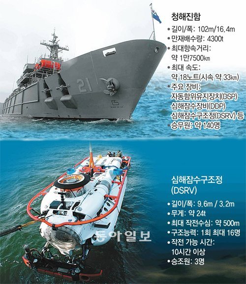 인양작전의 주역은 해군 구조함인 청해진함과 해난구조대(SSU) 소속 심해잠수사 대원들.