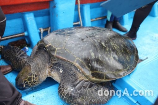 제주해양경찰서는 그물에 걸린 푸른바다거북은 “몸 길이가 97cm에 이르며, 암컷이다. 나이는 무려 200~300살인 것으로 추정된다”고 밝혔다.