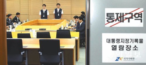 여야 의원 10명으로 구성된 ‘2007년 남북정상회담 관련자료 열람위원단’이 17일 경기 성남시 국가기록원을 찾아 열람 장소에 앉아 있다. 기록원은 의원들이 열람하기 전 열람 장소를 취재진에 잠시 공개했다. 성남=변영욱 기자 cut@donga.com