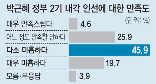 조사 결과 박 대통령이 정홍원 국무총리의 유임을 결정하면서 “높아진 인사기준 탓에 사람을 찾기 어렵다”고 언급한 대목에 대해서는 ‘인사 논란의 책임을 회피하는 것으로 공감하지 않는다’는 응답이 52.1%를 차지했다. 공감한다는 답은 42.3%. 다만 인사청문회를 개선해야 한다는 의견(54.4%)이 현행대로 유지해야 한다(40.1%)는 의견보다 많았다.