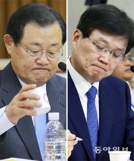 이병기 국가정보원장 후보자가 7일 인사청문회에서 답변을 하다 입술을 꽉 다문 굳은 표정으로 종이컵을 집어 들고 있다(왼쪽 사진). 오른쪽은 최양희 미래창조과학부 장관 후보자가 이날 인사청문회에서 의원들의 질문을 들으며 답변 자료를 검토하고 있는 모습.