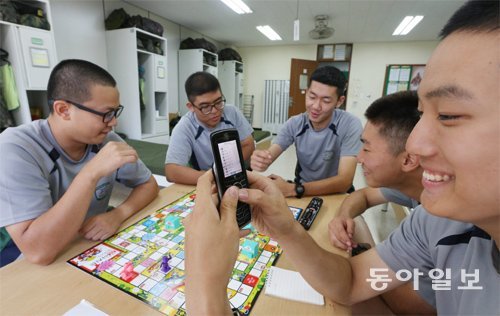 6일 경기 파주시 육군 25사단 이등병 생활관에서 한 병사가 계급별로 시범 지급된 수신 전용 2세대(2G) 휴대전화를 사용하고 있다.