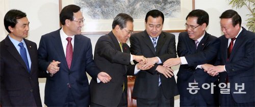 30일 서울 영등포구 여의도 국회 운영위원장실에서 여야 원내대표단이 올해 마지막 주례회동을 마친 뒤 손을 맞잡고 포즈를 취했다. 왼쪽부터 새정치민주연합 안규백 원내수석부대표, 새누리당 주호영 정책위의장, 새정치연합 우윤근 원내대표, 새누리당 이완구 원내대표, 새정치연합 백재현 정책위의장, 새누리당 김재원 원내수석부대표.