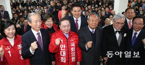 안대희 전 대법관(왼쪽 앞줄에서 세 번째)이 1일 서울 마포구 20대 총선 선거사무소 개소식을 열고 있다. 그는 마포갑 새누리당 예비후보로 등록한 상태다. 왼쪽부터 조윤선 전 대통령정무수석비서관, 이용훈 전 대법원장, 황인자 의원, 안 전 대법관, 김태호 최고위원, 박관용 전 국회의장, 김동길 연세대 명예교수, 이주영 의원.