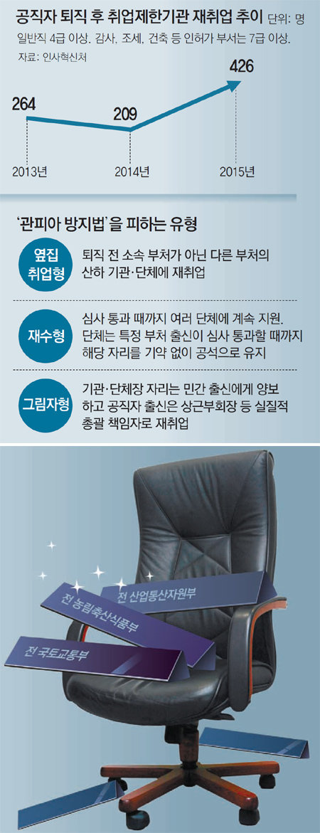 그러나 시행 1년이 지나면서 새로운 법이 내세운 취지와 현실의 괴리는 오히려 커져만 가고 있다. 강화된 법망을 피하기 위해 각종 꼼수를 동원해 재취업하는 경우도 적지 않다. ‘관피아’를 원하는 기업이나 단체의 수요가 줄지 않은 상황에서 재취업 제한만 앞세운 단순한 규제가 한계에 부딪힌 것이라는 지적이 나온다.