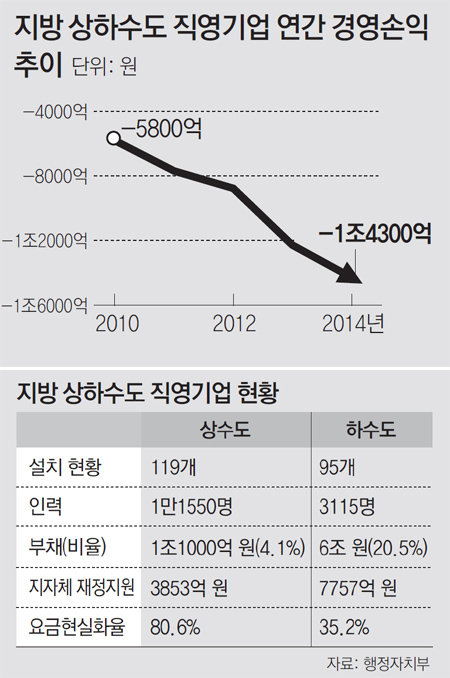 전국 총 214개 지방 상하수도 직영기업의 연간 적자는 1조4300억 원(2014년 기준)에 이른다. 적자 규모는 2010년의 5800억 원에서 4년 만에 3배 가까이로 불어났다. 서울과 광주, 울산 등 16개 직영기업을 제외한 92%가 이익을 한 푼도 내지 못하고 있다. 막대한 손실을 보전하기 위해 매년 적자 규모에 버금가는 지자체 재정이 투입되면서 ‘돈 먹는 하마’ 신세로 전락했다.