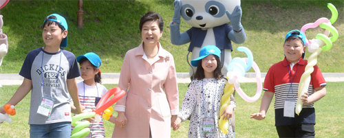박근혜 대통령이 5일 청와대 녹지원에서 열린 ‘2016년 어린이날 청와대 봄나들이’ 행사에 참석한 어린이들의 손을 잡은 채 환하게 웃으며 걷고 있다. 이날 박 대통령은 “어린이 여러분의 꿈이 이뤄져 밝은 미래가 열릴 때 우리나라도 밝은 미래를 기약할 수 있다”고 말했다.