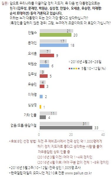 이어 오세훈 전 서울시장(9%), 박원순 서울시장(6%), 김무성 전 새누리당 대표(5%), 유승민 무소속 의원(3%), 이재명 성남시장(2%), 심상정 정의당 대표(1%) 순으로 응답됐고 4%는 기타 인물, 33%는 의견을 유보했다.