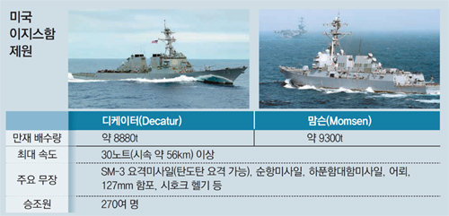 주한미군 소식통에 따르면 미 해군 이지스함인 디케이터(DDG-73·8880t)와 맘슨(DDG-92·9300t)이 19일부터 서·남해상에서 한국 해군 구축함, 대잠헬기 등과 함께 대함, 대잠 훈련을 진행한다. 미 해군의 서태평양 전진배치선단 소속인 이 이지스함들에는 북한의 탄도미사일을 요격할 수 있는 SM-3 미사일과 수천 km 밖의 표적을 정밀 타격할 수 있는 크루즈 미사일, 어뢰, 함포 등이 탑재돼 있다.
