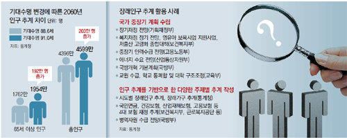 《 새로운 조사 방식과 예측 모형을 적용해 정확도를 높인 ‘신(新) 장래인구 추계(2015∼2065)’가 나온다. 이 통계 데이터는 최근 우리 국민의 기대수명이 점점 높아지고 있는 가운데 국가 재정과 4대 연금 재정 등의 정밀한 전망을 위해서는 보다 정확한 인구 통계가 필요하다는 요구에서 만들어진 것이다. 신 장래인구 추계를 적용하면 현재 한국인의 기대수명은 5년 전 추계보다 1, 2세가량 높아질 것으로 추정된다. 》