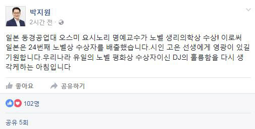 박 비대위원장은 이날 자신의 페이스북에 "일본 동경공업대 오스미 요시노리 명예교수가 노벨 생리의학상 수상!. 이로써 일본은 24번째 노벨상 수상자를 배출했습니다"라며 "우리나라 유일의 노벨 평화상 수상자이신 DJ의 훌륭함을 다시 생각케하는 아침입니다"라고 글을 썼다.
