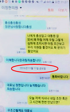 실제로 사진을 보면 “이해합니다. 죄송합니다”라는 이정현 대표의 마지막 문자 수신시간이 오후 1시 32분이며, 이후 날짜가 하루 이상 넘어갔을 때 나타나는 날짜 구분 표시가 등장한다.
