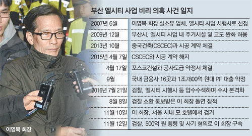 엘시티 사건은 부산 해운대에 최고 101층 규모의 주상복합단지를 짓는 사업의 인허가 과정에서 이 회장이 거액의 비자금을 조성해 정관계에 전방위 로비를 한 것으로 알려진 사건이다. 포스코건설이 두 번째 시공사로 등장하는 과정에서 정치권의 입김이 작용했다는 의혹도 있다. 부산지검은 100일가량 도피하던 이 회장을 지난달 체포해 500억 원대의 사기 및 횡령 혐의로 구속 수사하고 있다.