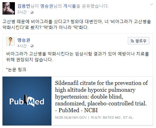 김 씨는 이날 자신의 페이스북에 ‘비아그라가 고산병을 악화시킨다는 임상시험 결과가 있어 예방이나 치료를 위해 권장되지 않는다’라는 명승권 국제암대학원대학교 암관리정책학과 교수의 페이스북 글을 링크하며 “고산병 때문에 비아그라를 샀다고? 청와대 대변인아, ‘비아그라가 고산병을 약화시킨다’로 봤지? ‘약’화가 아니라 ‘악’화다”라고 지적했다.