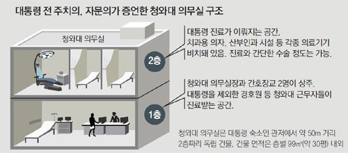 2층은 대통령 진료를 위한 공간이다. 2층에는 응접실과 치과용 의자, 산부인과 시설 등 각종 의료기기가 비치된 진료실이 있다. 또 다른 방에는 침대 2개가 있다. 익명을 요구한 전 대통령 주치의는 “기본적인 진료는 물론이고 간단한 수술까지 가능한 수준의 시설”이라고 말했다. 의무실에 없는 의료기기는 청와대 인근에 있는 서울지구병원에서 들여오기도 한다. 서울 종로구 삼청동에 있는 서울지구병원은 서울 시내의 유일한 군 병원이다. 대통령과 가족, 총리나 장차관 등의 진료를 담당한다. 다만 대통령에 따라 의무실 내 시설과 위치는 조금씩 달라지기도 한다. ○ 주치의-자문의-의무실장 ‘삼각 편대’