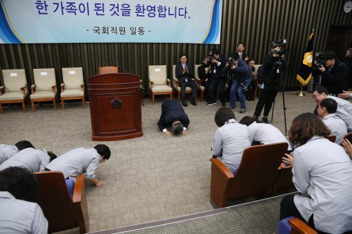우윤근 사무총장은 2일 오전 서울 여의도 국회에서 열린 '청소근로자 직접고용 기념 신년행사'에서 청소근로자들에게 큰절하며 "너무 늦게 직원으로 모셨다. 앞으로 잘 모시겠다"고 말했다. 앞자리에 있던 청소근로자들도 맞절로 화답했다.