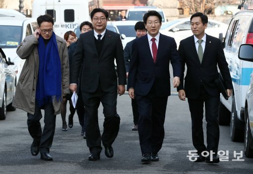 사진=박근혜 대통령 탄핵심판 첫 변론기일인 3일 오후 국회 탄핵소추 위원인 이춘석, 권성동 의원(왼쪽 두 번째부터)이 서울 종로구 헌번재판소로 들어가고 있다. 김재명 기자 base@donga.com