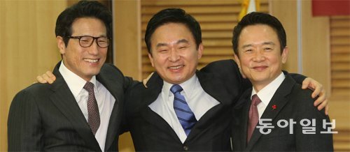 새누리당을 탈당해 개혁보수신당(가칭)에 합류한 원희룡 제주도지사(가운데)가 4일 서울 여의도 국회 의원회관에서 열린 개혁보수신당 창당추진위원회에 참석해 정병국 위원장(왼쪽), 남경필 경기도지사와 어깨동무를 하고 있다.