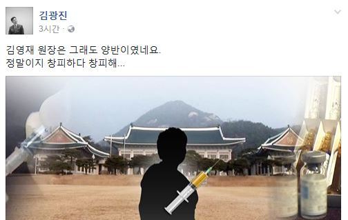 더불어민주당 김광진 전 의원은 6일 박근혜 대통령의 ‘비선 진료’ 의혹을 받고 있는 ‘백 선생’이 73세 불법 시술 전과자였다는 소식을 전하면서 “정말이지 창피하다”고 밝혔다.