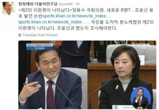 더불어민주당 정청래 전 의원은 9일 조윤선 문화체육관광부 장관을 옹호하는 듯한 발언을 한 새누리당 엄용수 의원을 겨냥해 “제2의 이완영이 나타났다”고 맹비난했다.