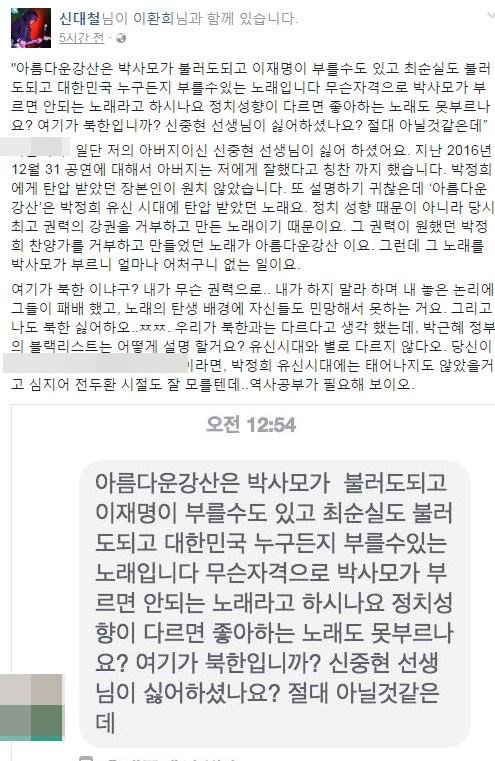 신대철 씨는 이날 자신의 페이스북에 한 회원이 자신에게 개인적으로 보낸 메시지를 캡처해 공개했다.