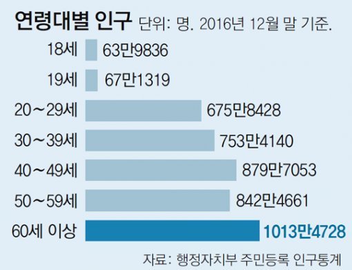 10일 동아일보가 행정자치부의 주민등록 인구통계를 분석한 결과 지난해 12월 말 기준으로 만 60세 이상 인구는 1013만여 명이었다. 지난해 9월 1000만 명을 넘어섰다. 직전 선거인 지난해 4·13총선 당시의 약 983만 명과 비교하면 30만 명이 늘었다. 60세 이상 유권자가 682만여 명이던 2007년 17대 대선에 비해선 332만 명이나 증가했다. 전체 유권자(19세 이상 인구)에서 차지하는 비중도 같은 기간 18.0%에서 23.9%로 6%포인트 가까이 상승했다.