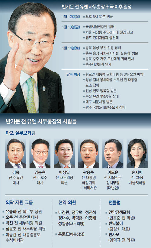 반 전 총장의 귀국에 맞춰 대선 행보를 지원할 ‘반기문의 사람들’도 윤곽을 드러내고 있다. 메시지와 일정을 담당할 실무보좌팀은 현재 11명으로 구성됐다. 컨트롤타워는 반 전 총장의 오랜 측근인 김숙 전 주유엔 대사다. 이상일 전 의원은 정무자문, 곽승준 전 대통령국정기획수석비서관은 경제자문, 손지애 전 CNN 서울지국장은 부대변인을 각각 맡는다. ‘네거티브 대응’을 전담하는 변호사와 정치권 출신 인사들도 회의 멤버로 참여하고 있다.