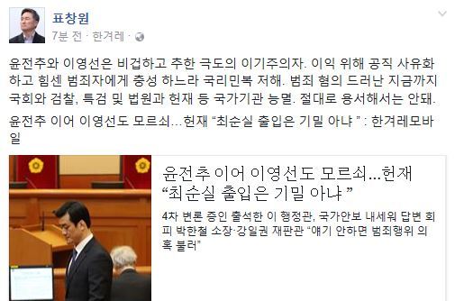 표창원 의원은 이날 자신의 소셜미디어에 ‘윤전추 이어 이영선도 모르쇠…헌재 “최순실 출입은 기밀 아냐”’라는 제목의 기사를 공유하면서 이같이 밝혔다.
