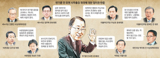 더불어민주당, 국민의당 등 야권은 12일 귀국한 반기문 전 유엔 사무총장을 철저히 검증하겠다고 벼르고 있다. 이에 맞서 반 전 총장은 12일 귀국한 직후 가진 기자회견에서 “양심에 부끄러운 일이 없다”라며 의혹을 일축했다.