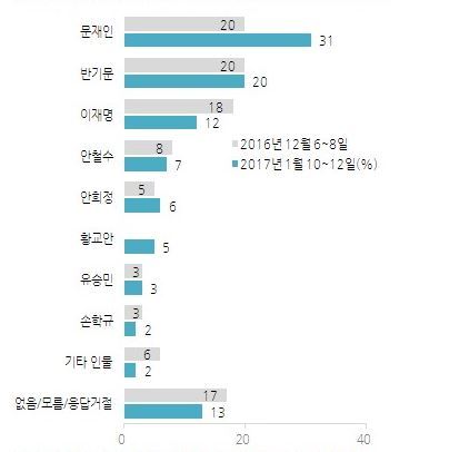 구체적으로 문재인 전 대표(31%), 반기문 전 총장(20%), 이재명 성남시장(12%), 안철수 전 국민의당 공동대표(7%), 안희정 충남지사(6%), 황교안 국무총리(5%), 유승민 바른정당 의원(3%), 손학규 전 의원(2%) 등의 순으로 나타났다. 2%는 기타 인물, 13%는 의견을 유보했다.