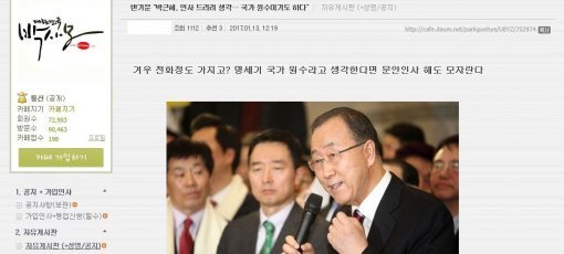 박사모 회원 탄핵****을 사용하는 누리꾼은 이날 박사모 홈페이지에 “반기문 ‘박근혜, 인사 드리려 생각…국가원수이기도 하다’라는 제목의 기사를 공유했다.