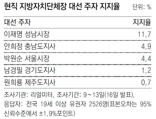 이인제 전 경기도지사의 1997년 대선 출마 이후 대권을 향한 지방자치단체장의 ‘벽’은 허물어졌다. 특히 이명박 전 서울시장의 대통령 당선으로 수도권 광역단체장은 대권으로 가는 디딤돌처럼 여겨졌다. 이번 대선에선 지자체장의 출마가 봇물 터지듯 할 뿐만 아니라 기초단체장인 이재명 경기 성남시장과 비수도권 단체장인 안희정 충남도지사 등 ‘변방’의 도전이 두드러진다. 안 지사는 최근 리얼미터 조사에서 5%를 기록하는 등 지지율이 꾸준히 상승하면서 이번 대선의 ‘다크호스’로 떠오르고 있다. 지자체장들은 문 전 대표와 반 전 총장의 선두 경쟁 틈바구니에서 존재감을 부각시키려고 애쓰는 형국이다.