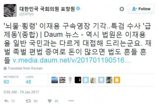 표 의원은 “역시 법원은 이재용을 일반 국민과는 다르게 대접한다”면서 “재벌·족벌·편법 증여라도 돈만 많으면 법도 ‘흔들흔들’”이라고 적었다.