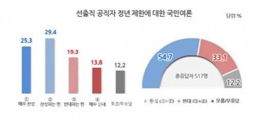 여론조사업체 리얼미터가 18일 성인 517명을 대상으로 여론조사한 결과 ‘정년 제한에 찬성한다’는 응답은 54.7%로, ‘반대한다’는 응답 33.1%보다 20%p 가량 높았다.