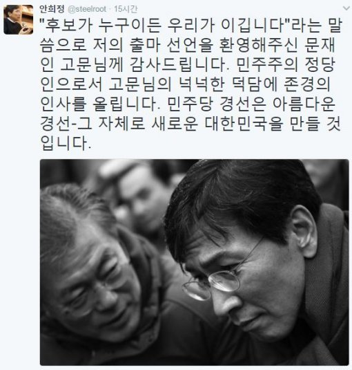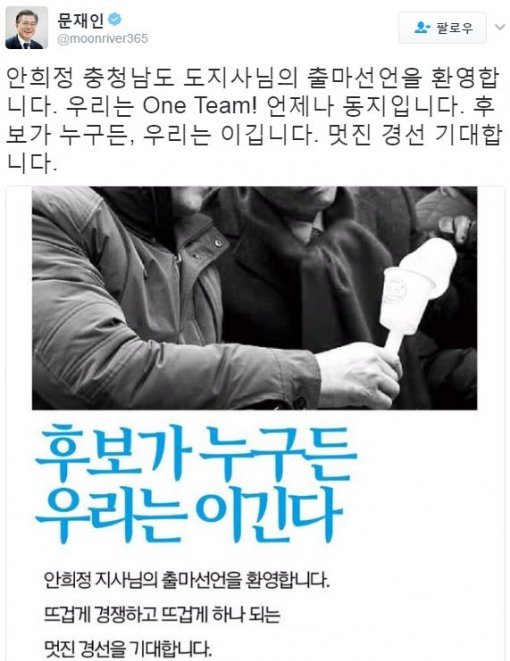 이에 문 전 대표는 자신의 트위터에 “안 지사의 출마선언을 환영한다. 우리는 One Team(원팀)! 언제나 동지”라며 “후보가 누구든, 우리는 이긴다. 멋진 경선을 기대한다”고 글을 올렸다.