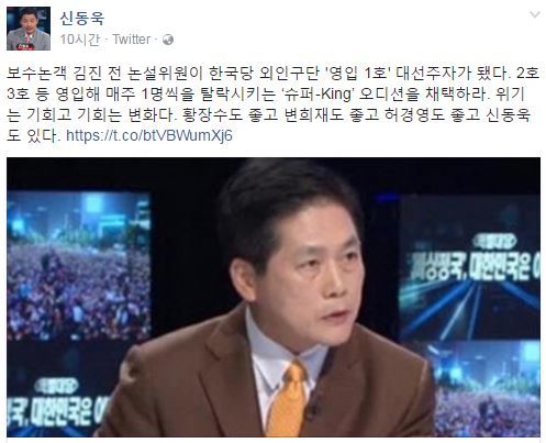 신 총재는 이날 자신의 페이스북에 "보수논객 김진 전 논설위원이 한국당 외인구단 '영입 1호' 대선주자가 됐다"고 알리며 "2호 3호 등 영입해 매주 1명씩을 탈락시키는 ‘슈퍼-King’ 오디션을 채택하라"고 글을 올렸다.
