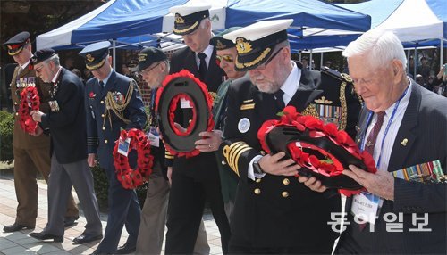24일 경기 가평군에서 열린 6·25전쟁 가평전투 66주년 기념식에서 영국 캐나다 호주 뉴질랜드 등 영연방 4개국 참전용사들이 참전기념비에 헌화하고 있다. 기념식에 참석한 얼 하우 영국 국방차관은 “함께라면 불가능한 것이 없다는 것을 기억할 것”이라고 말했다.