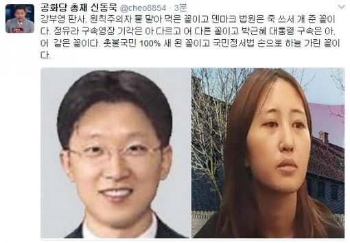 이날 신 총재는 트위터에 “강부영 판사, 원칙주의자 물 말아 먹은 꼴이고 덴마크 법원은 죽 쒀서 개 준 꼴이다”라며 글을 남겼다.
