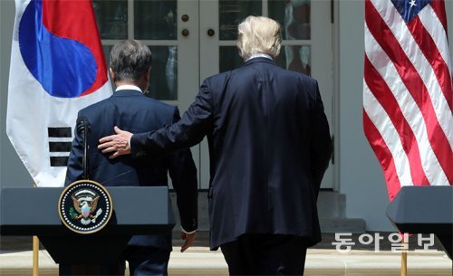 6월 30일(현지 시간) 미국 백악관 로즈가든에서 도널드 트럼프 미국 대통령(오른쪽)이 공동 기자회견을 마치고 퇴장하면서 문재인 대통령의 등에 손을 올리고 있다. 워싱턴=원대연 기자 yeon72@donga.com