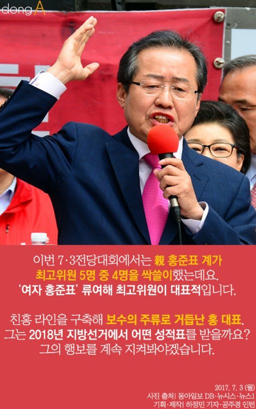 #. 이번 7·3전당대회에서는 홍 대표의 당선 외에도 친(親) 홍준표계가 최고위원 5명 중 4명을 싹쓸이했는데요. ‘여자 홍준표’ 류여해 최고위원이 대표적입니다.