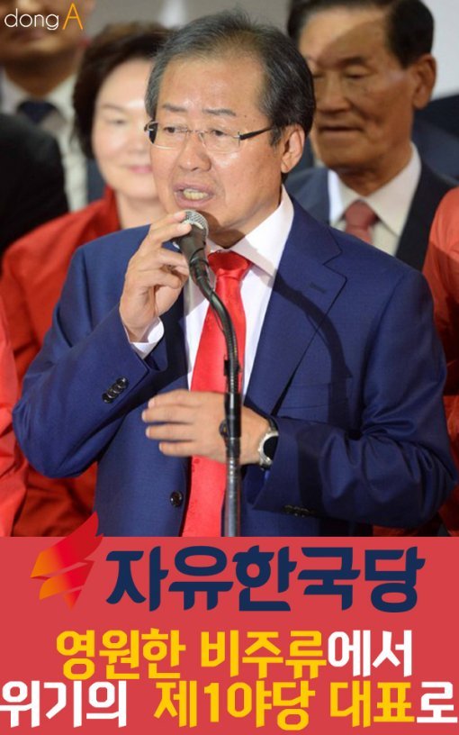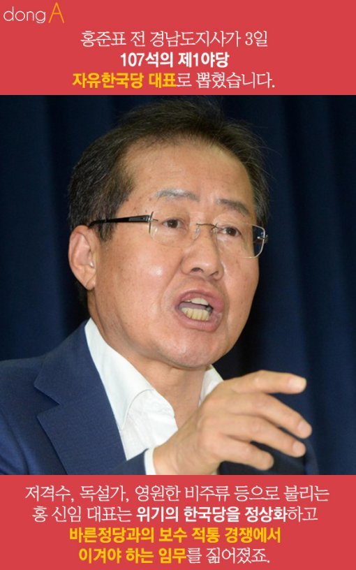 ‘저격수’, ‘독설가’, ‘영원한 비주류’로 불리는 홍 신임 대표. 위기의 한국당을 정상화하고 바른정당과의 보수 적통 경쟁에서 이겨야 하는 임무를 짊어졌죠.