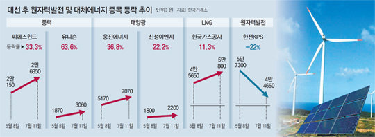 정부가 신규 원자력발전소 건설을 백지화하는 등 ‘탈원전 시대’를 선언하면서 에너지주의 희비가 엇갈리고 있다. 풍력과 액화천연가스(LNG) 등 대체에너지 관련 업종은 대선 후 두 달 가까이 신바람이 난 반면, 원전 관련주는 고전을 거듭하고 있다. 정부가 8월 신재생에너지 확대 계획을 내놓으면 원전 관련주들은 한 번 더 요동칠 것으로 전문가들은 예상했다.