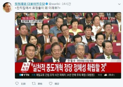이어 정 전 의원은 안 대표 당선 발표 당시 국민의당 지도부들의 표정이 잡힌 방송을 캡처하며 "잔치집에서 표정들이 왜 이래유?"라고 말했다. 카메라에 잡힌 지도부의 표정은 뚱했다.