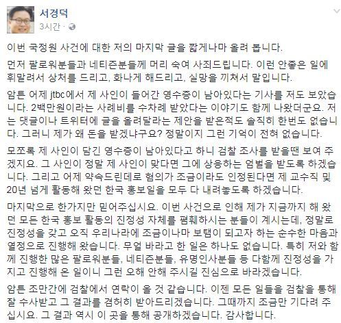 서교수는 "모쪼록 제 사인이 담긴 영수증이 남아있다고 하니 검찰 조사를 받을땐 보여 주겠지요. 그 사인이 정말 제 사인이 맞다면 그에 상응하는 엄벌을 받도록 하겠습니다. 그리고 어제 약속드린데로 혐의가 조금이라도 인정된다면 제 교수직 및 20년 넘게 활동해 왔던 한국 홍보일을 모두 다 내려놓도록 하겠습니다"라고 약속했다.